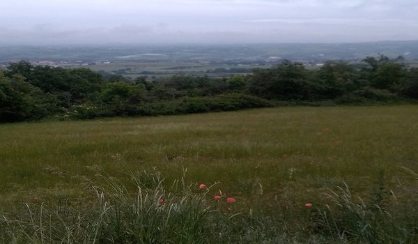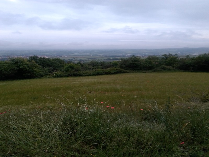 En traversant le ruisseau de Vallières, je ne me doutais pas encore que la montée vers le calvaire du Plat St Romain serait celui de mon ami, dont seul le dérailleur arrière x5 fonctionne... Mais la route est goudronnée tout du long et la vue compense largement. Nous prenons le temps arrivés au Belvédère d’avaler une barre de céréales et de l’eau devant la vue et les coquelicots.